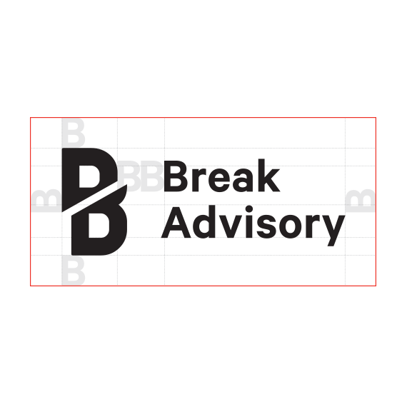 The Break Advisory brand has two distinct parts: symbol (isotype) and logo. Both parts can work together as a unified brand, but we can use the symbol independently (1). There is also a mono-line version for situations in which a very horizontal use of the mark is required (2). There are certain safety margins or spacing that must be respected to prevent the mark from losing its impact or being threatened by other graphic elements (3). The security area is based on a graphic element that is derived from the brand itself: the initial B of the main logo.